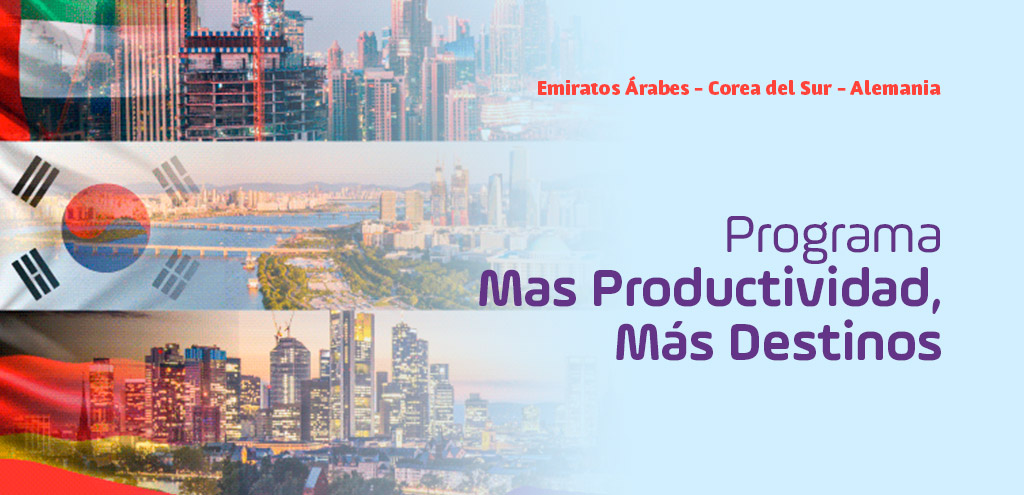 Si quieres crecer en el mercado internacional y vender tus productos en países como Emiratos Árabes, Corea del Sur y Alemania te invitamos a participar en la convocatoria del Programa “Más Productividad, Más Destinos”, donde podrás conocer más sobre esta iniciativa y cómo puedes ser parte de ella.